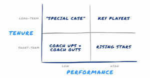 What’s the Problem? Think about each of your team members in two ways: how long they’ve been with you and how well they perform. That framework reveals four kinds of employees. Take a look: Long-term, high-performing employees are your key players. New, high-performing employees are your rising stars. These two are every manager’s favorites, for
